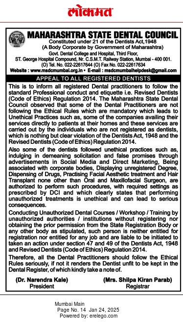 The Council is entrusted with the responsibility of regulating the dental profession and ensuring the highest standards of ethics, and practice in the State of Maharashtra.