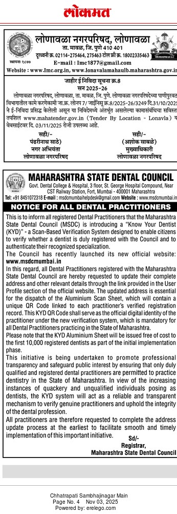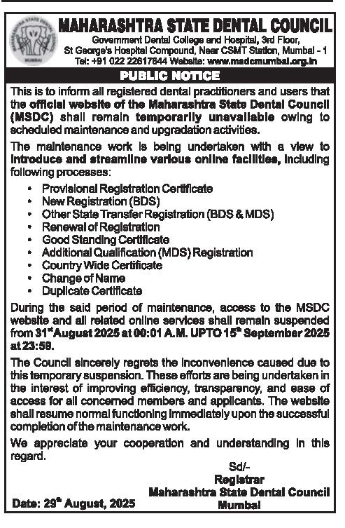 The Maharashtra State Dental Council (MSDC) is a statutory body constituted under the provisions of the Dentists Act, 1948, and functions in accordance with the Bombay Dentists Rules, 1951.
